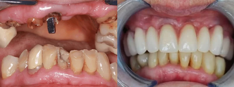 This lady had all of her upper teeth removed, 6 implants fitted and a dental bridge fitted to them all on the same day. She went from struggling to eat and embarrassed about smiling, and in a single day was restored with a functioning, radiant smile!